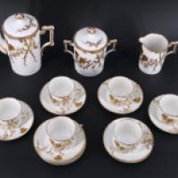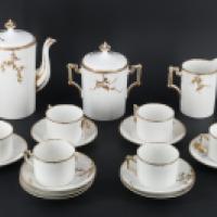 Partie de service à thé en porcelaine blanche à décor rehaussée d’or de végétaux comprenant : théière, sucrier couvert, pot à lait, six tasses et neuf sous-tasses