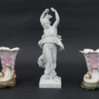 Paire de vases en porcelaine polychrome simulant une corne d’Abondance / Femme à l’antique en biscuit