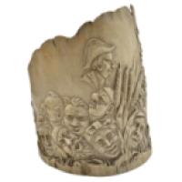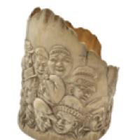 Sujet en ivoire d’éléphant (Elephas maximus, Loxodonta africana ou Loxodonta cyclotis) sculpté en bas-relief dans un tronçon de base de défense d’une frise de têtes de caractère grotesques.