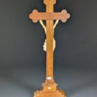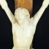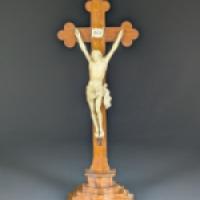 Cristo Vivo et son titulus crucis en ivoire d’éléphant (Elephas maximus, Loxodonta africana ou Loxodonta cyclotis) sculpté fixé sur une croix trilobée en noyer reposant sur une base à quatre gradins.