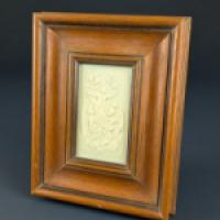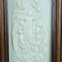 Plaquette en ivoire d’éléphant (Elephas maximus, Loxodonta africana ou Loxodonta cyclotis) sculptée en relief d’une scène représentant l’Assomption de la Vierge Marie. Encadrement en bois postérieur.