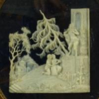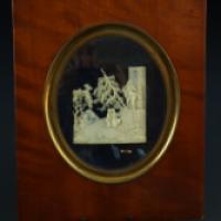 Plaquette en ivoire d’éléphant (Elephas maximus, Loxodonta africana ou Loxodonta cyclotis) sculpté à jour d’une scène représentant un jeune couple agenouillé devant un satyre jouant de la flûte de pan sur le perron d’un temple de l’Amour. Cadre en bois à lunette ovale en laiton.