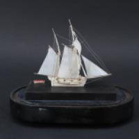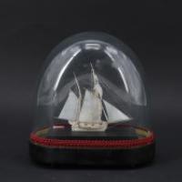 Maquette de navire et son annexe en ivoire d’éléphant (Elephas maximus, Loxodonta africana ou Loxodonta cyclotis) sous cloche de verre, fixée sur une base en bois noirci.