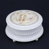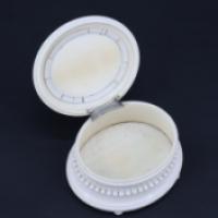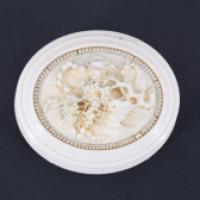 Coffret de forme ovale en ivoire d’éléphant (Elephas maximus, Loxodonta africana ou Loxodonta cyclotis) à décor en haut relief d’un bouquet de lilas et muguet sur le couvercle ouvrant par une charnière à deux pans, reposant sur quatre pieds boule.