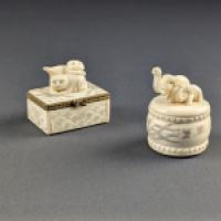 Lot de 2 boîtes en os sculpté (système de Havers constaté)à décor de chats et d'éléphants.