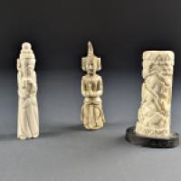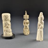 Lot de 3 sujets sculptés en os (système de Havers constaté) représentant un sage, une divinité, un totem à décor d'animaux.