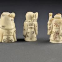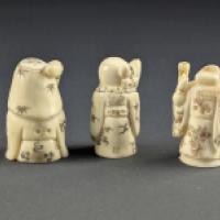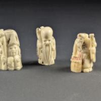 Lots de 3 netsukes en os et ivoire de morse (Odobenus rosmarus divergens) (système de Havers et dentines primaire et secondaire constatés) représentants des sage.