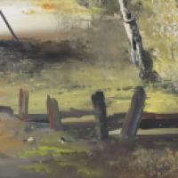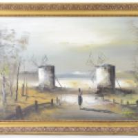 Ecole du XXe siècle, Paysage aux moulins, huile sur isorel, signée en bas à droite – 60 cm x 110 cm
