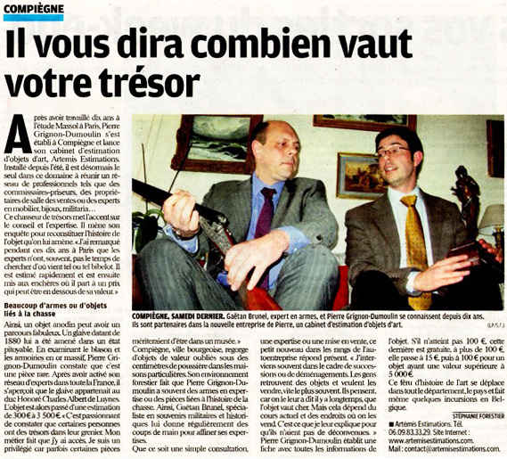 Après avoir travaillé dix ans à l'étude Massol à Paris, Pierre Grignon-Dumoulin s'est établi à Compiègne et lance son cabinet d'estimation d'objets d'art, Artemis Estimations. Installé depuis l'été, il est désormais le seul dans ce domaine à réunir un réseau de professionnels ...