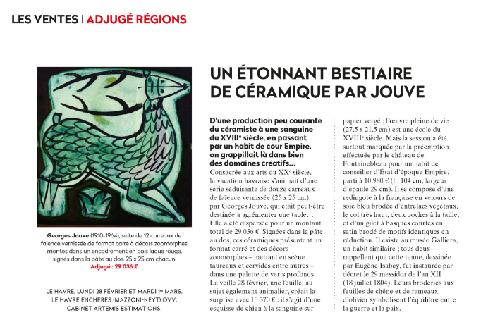 Découverte d'un dessin préparatoire de Jean-Baptiste Greuze, préemption d'un habit de coseiller d'état d'époque Empire par le châtau de Fontainebleau, une exceptionnelle suite de douze carreaux de céramique de Geaorges Jouve adjugée 29 036 €.