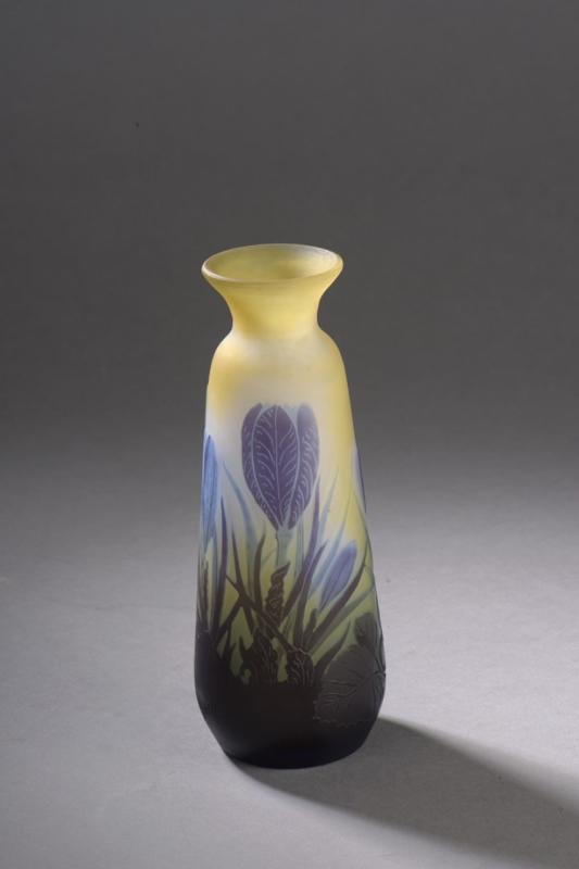 Vase légèrement piriforme à col étranglé et évasé. Épreuve de tirage industriel réalisée en verre doublé bleu sur fond jaune nuancé blanc. Décor de Crocus, gravé en camée à l'acide.