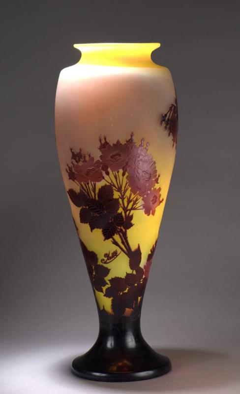 Important vase de forme balustre sur piédouche et col évasé. Épreuve de tirage industriel réalisée en verre doublé rouge sur fond jaune. Décor de rosiers, gravé en camée à l'acide.
