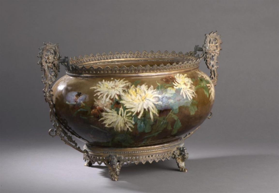 Grande jardinière à décor de chrysanthèmes sur fond brun dégradé, monture en métal ajouré, marques au revers MSL et J.