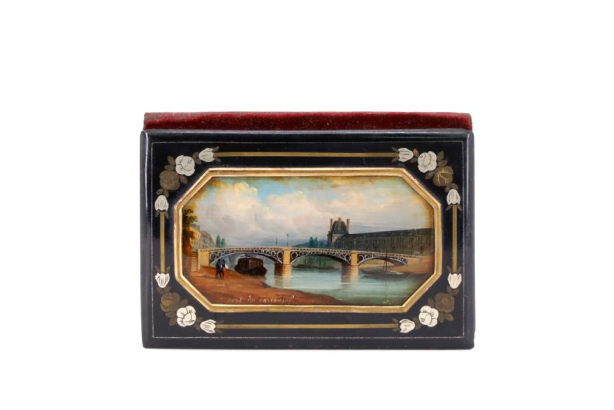 Carnet de bal en bois noirçi à incrustations d'un encadrement de fleurs, centré d'une miniature peinte à la gouache figurant le Pont du Carrousel, intérieur en soie - XIXe siècle - H. 9cm , L. 6 cm (fente au revers)