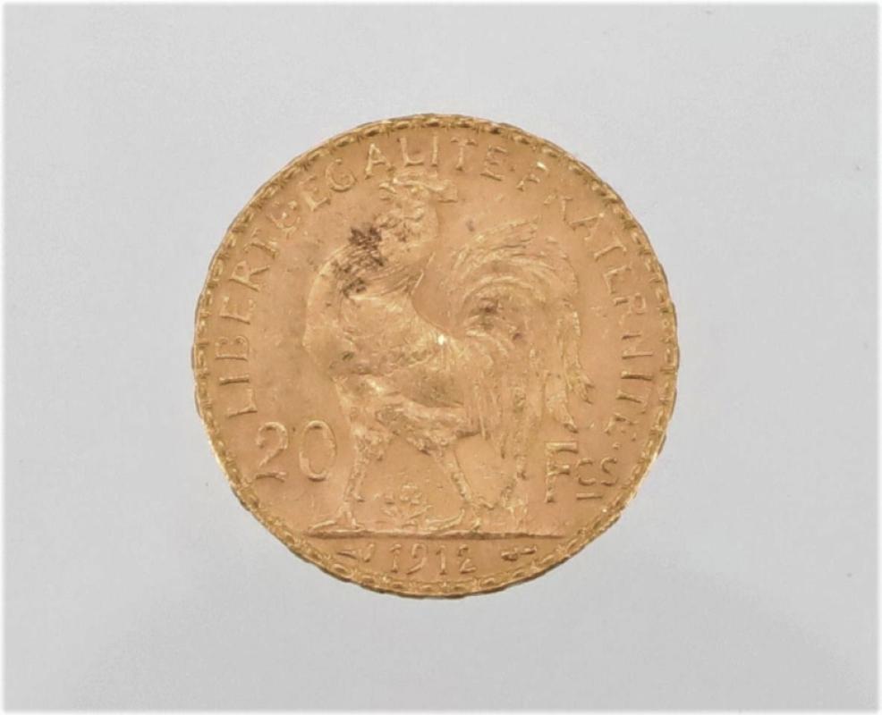 Monnaie de 20 francs or - type Coq - 1912 - Poids: 6,4 g.
