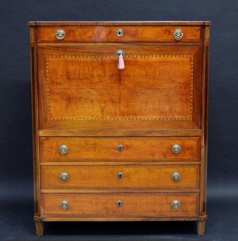 Secretaire en armoire formant commode en placage d'acajou avec encadrement marqueté de losanges sur un fond de citronnier. Montants à pans coupés en palissandre. Il ouvre en partie haute à un tiroir et en partie basse à trois tiroirs. Ouvert, l'abattant central tendu de cuir vert démasque huit tiroirs et deux casiers. Il repose sur quatre pieds gaine - XVIIIe siècle - H. 148 cm, L. 120 cm, P. 53 cm (restaurations)