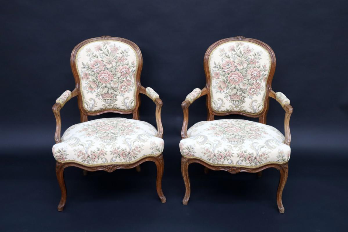 Paire de fauteuils en bois naturel, mouluré et sculpté à dossier cabriolet orné de fleurettes ainsi qu'en ceinture, quatre pieds cambrés.