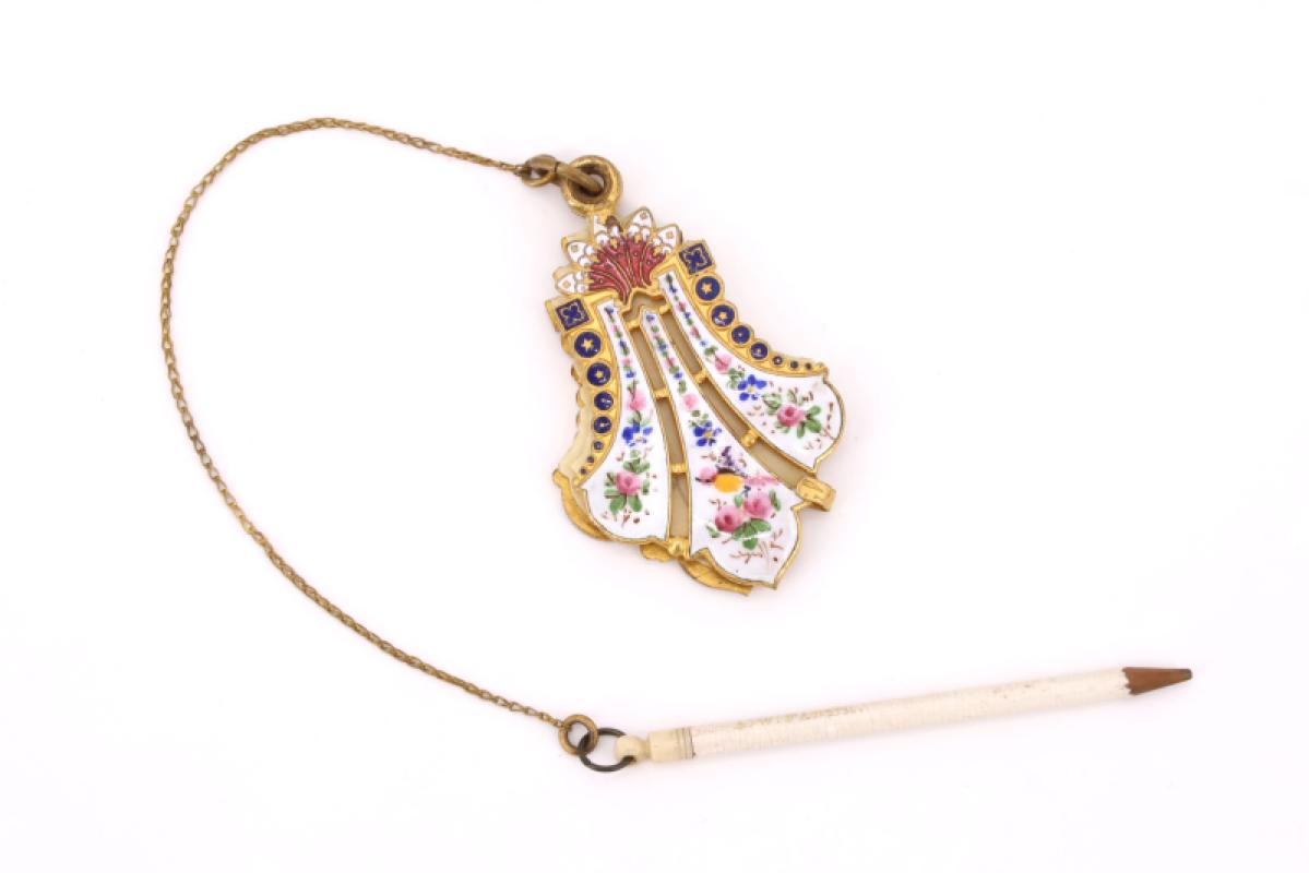 Carnet de bal en métal doré en forme de fleur de Lys à décor émaillé de fleurs et d'étoiles, support en os, chainette reliée à un crayon à papier marqué A. W. FABER