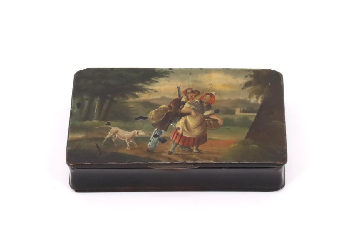 Boîte à priser en bois noirçi, à décor peint d'une scène galante entre un chasseur et une paysanne -XIXe siècle- H. 2 cm, L. 10,5 cm, P. 6,5 cm - (petits manques)