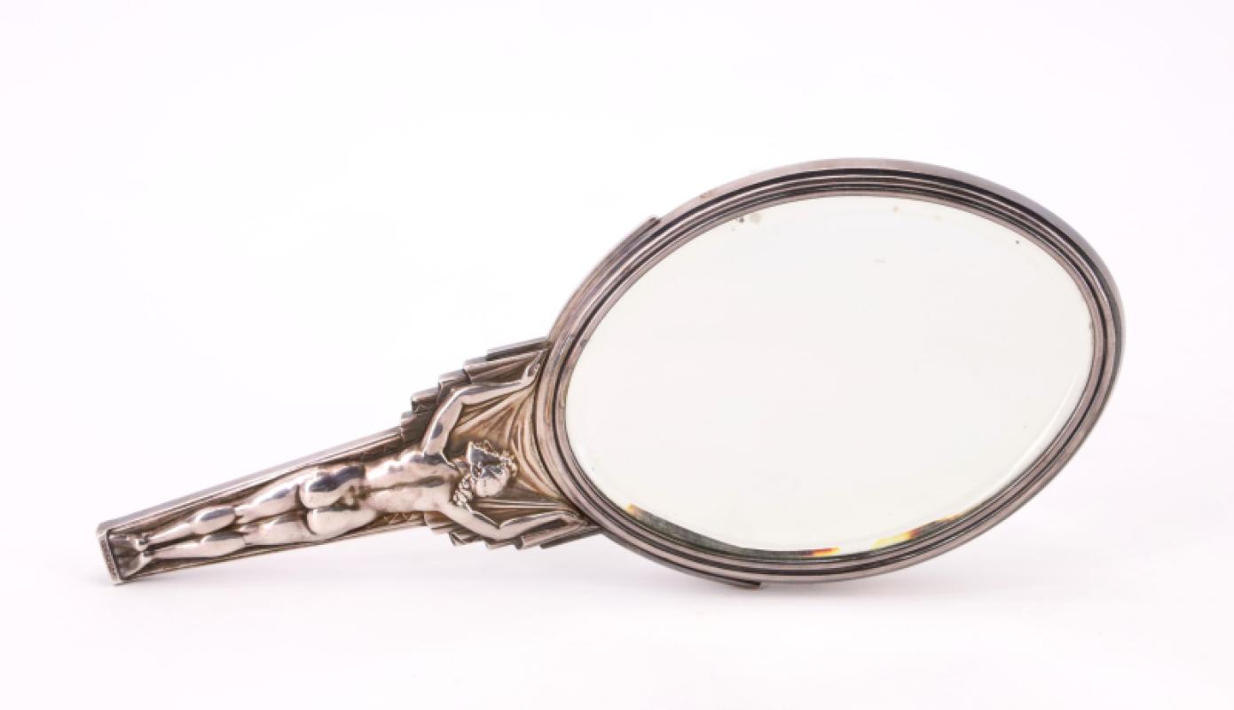 Face à main double face en bronze argenté figurant une jeune femme debout, nue, de dos, soutenant une draperie, glaces biseautées.