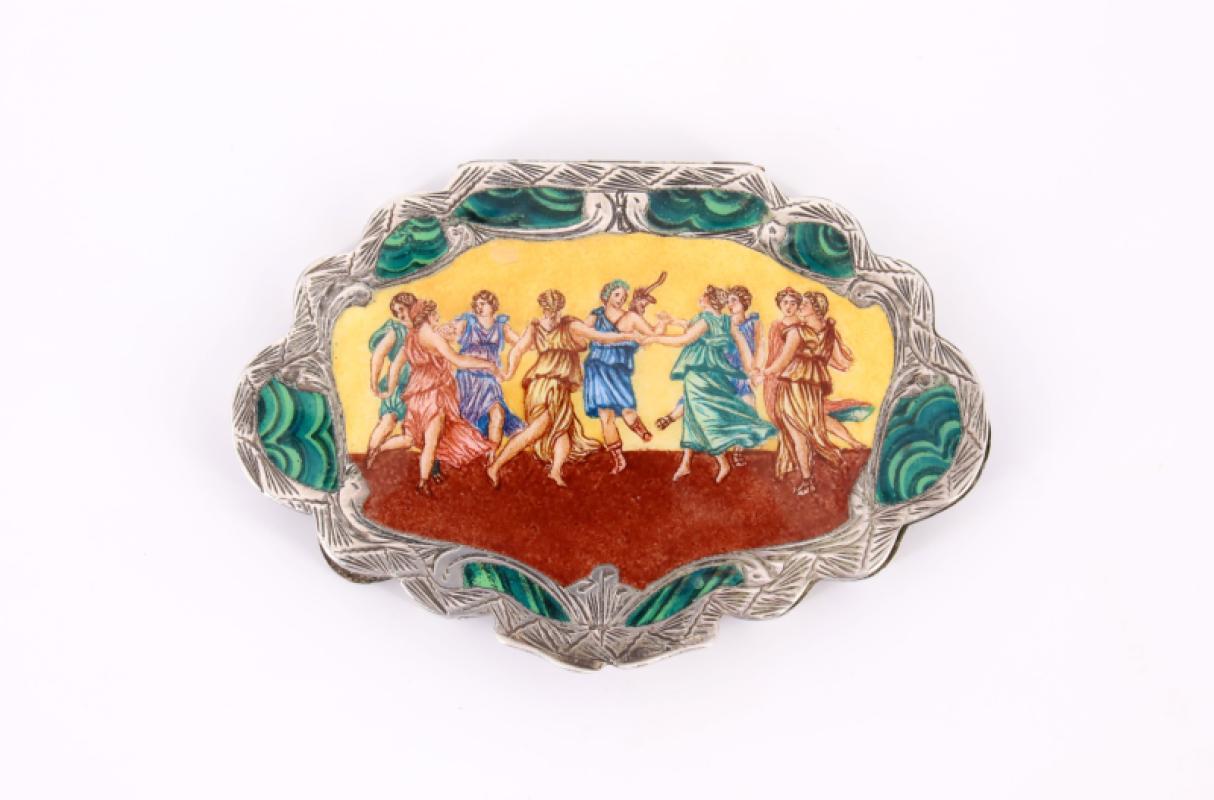 Boîte à poudre en métal argenté à décor peint d'une scène de danse antique et entourage à l'imitation de la malachite, revers ciselé d'une large feuille d'acanthe -