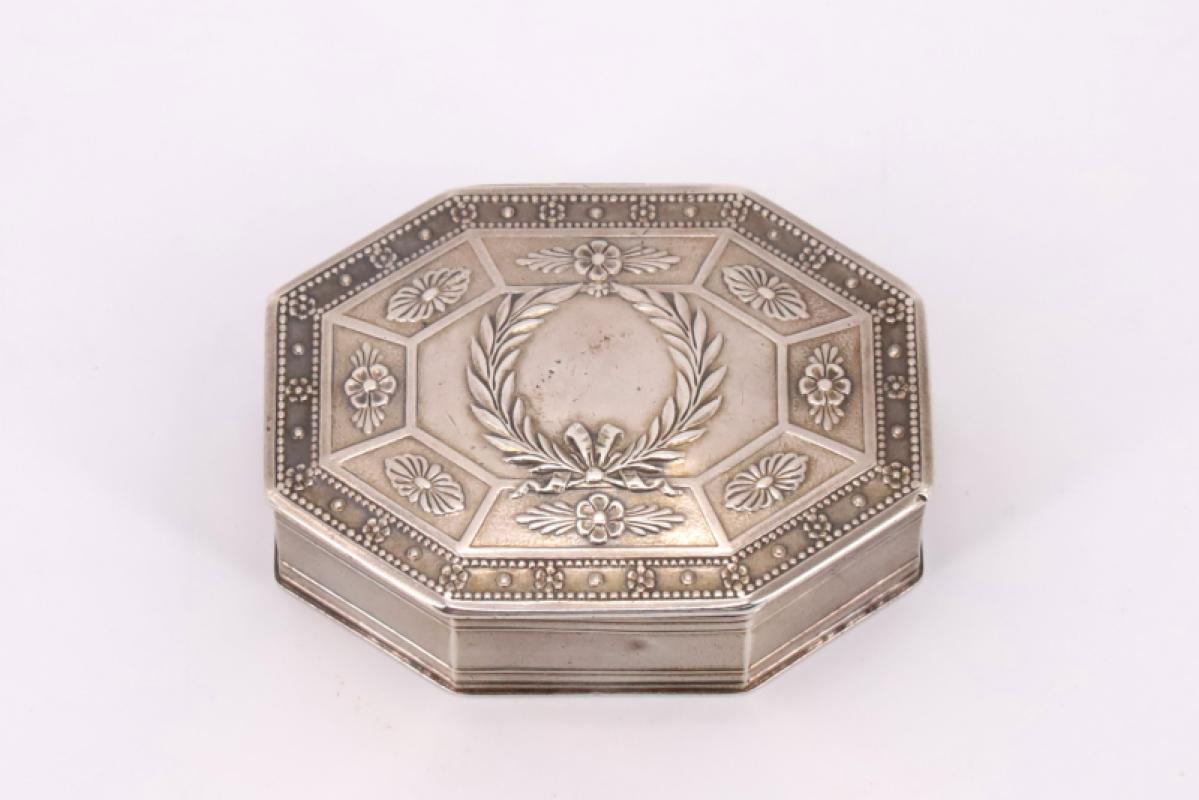 Boîte en argent de forme octogonale à décor ciselé d'une couronne de laurier, fleurettes et perles - Style Empire, poinçon Minerve