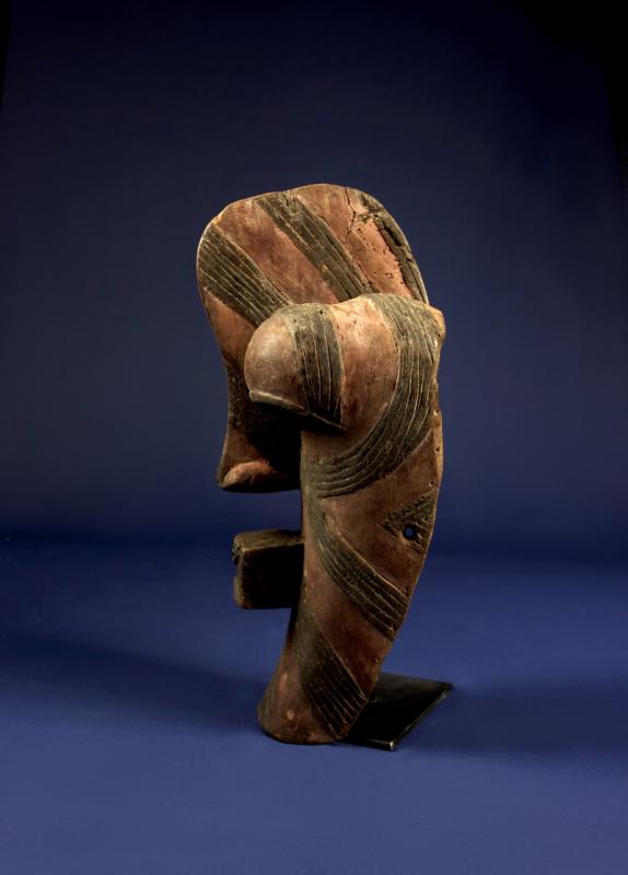 Masque d’un visage scarifié à fond brun rouge, scarifications noires.