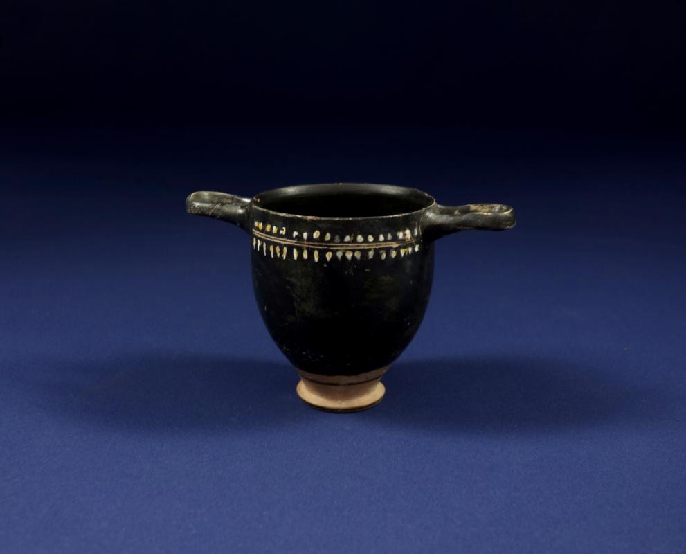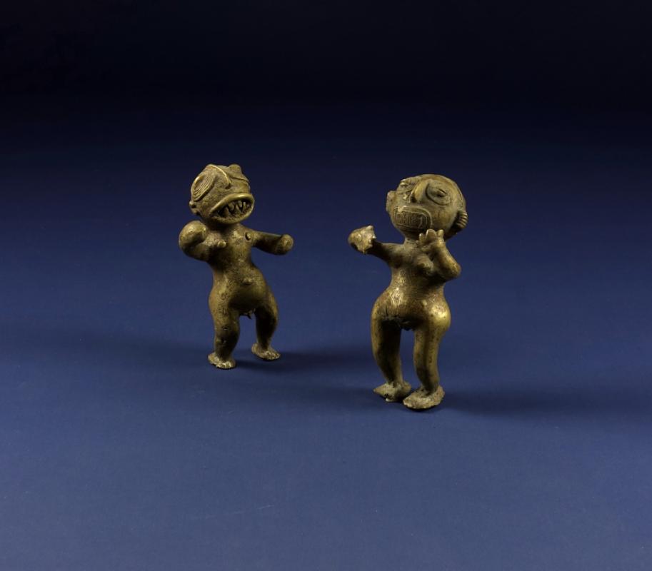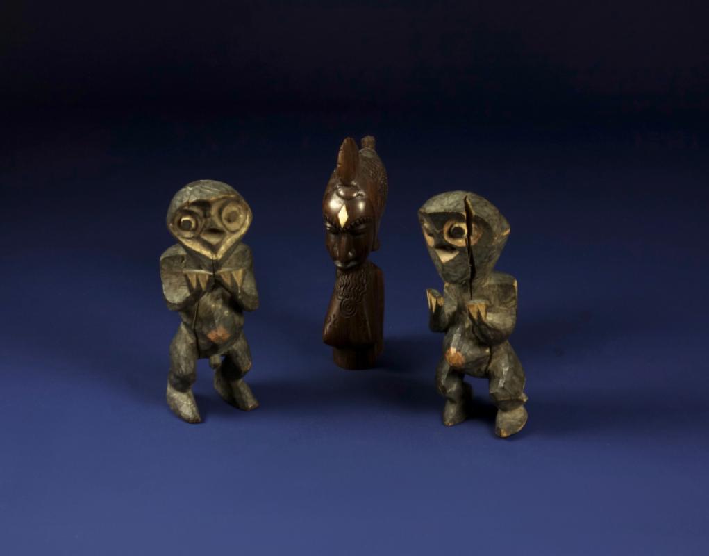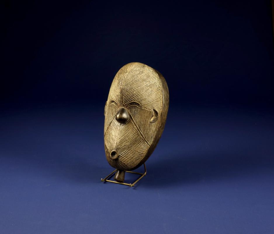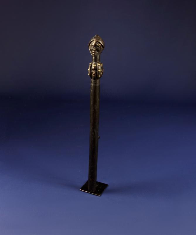 Sceptre représentant une tête ornée de clous en cuivre, surmontant une couronne de 4 visages directionnels.