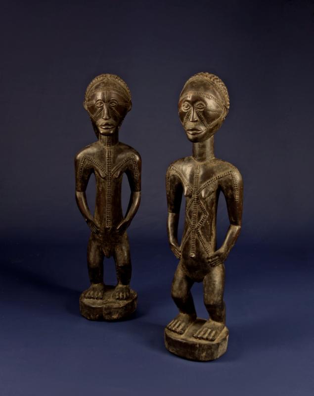 Couple en bois sculpté, on y joint un buste de femme en bois sculpté.