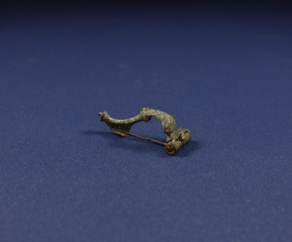 Fibule à ressort en bronze à belle patine verte, attache de l’épingle plate