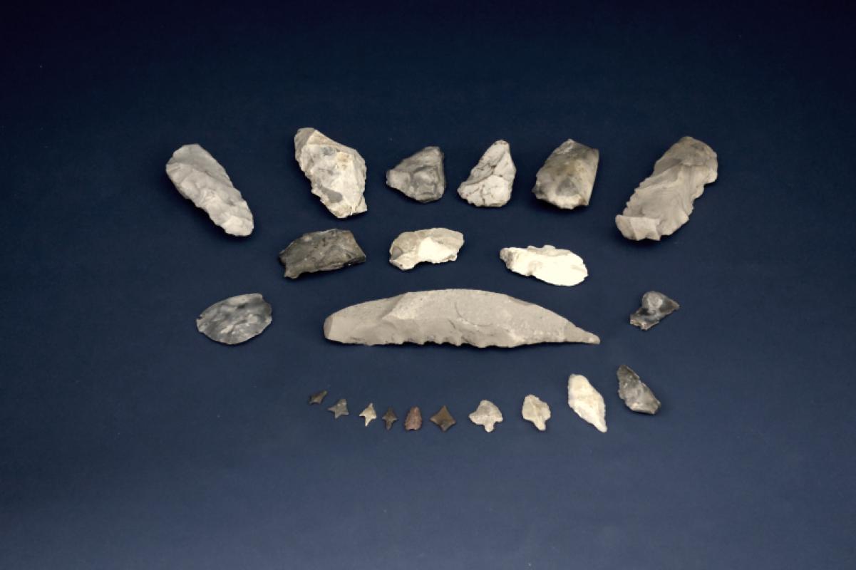 Collection de pierres taillées préhistoriques : pic, grattoir, racloir, pointes de flèche, silex, etc.