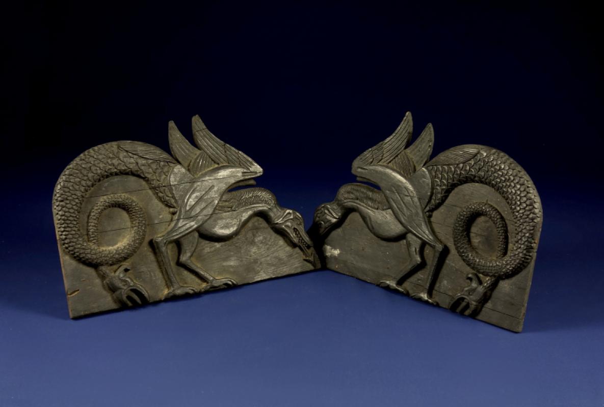 Paire de reliefs en bois sculpté noirci à décor d’animaux fantastiques