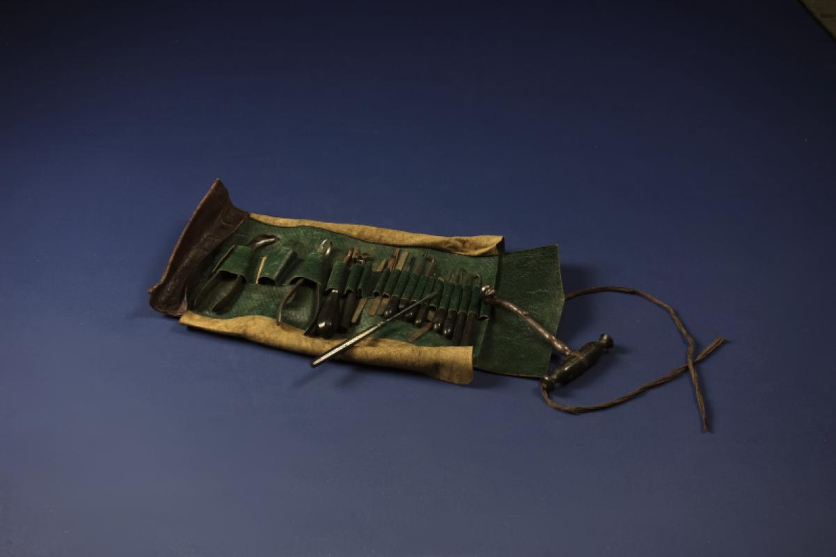 Nécessaire de chirurgie dentaire dans une trousse déployant en cuir, signée « Charrière à Paris », divers instruments (extracteur, pinces, etc.)