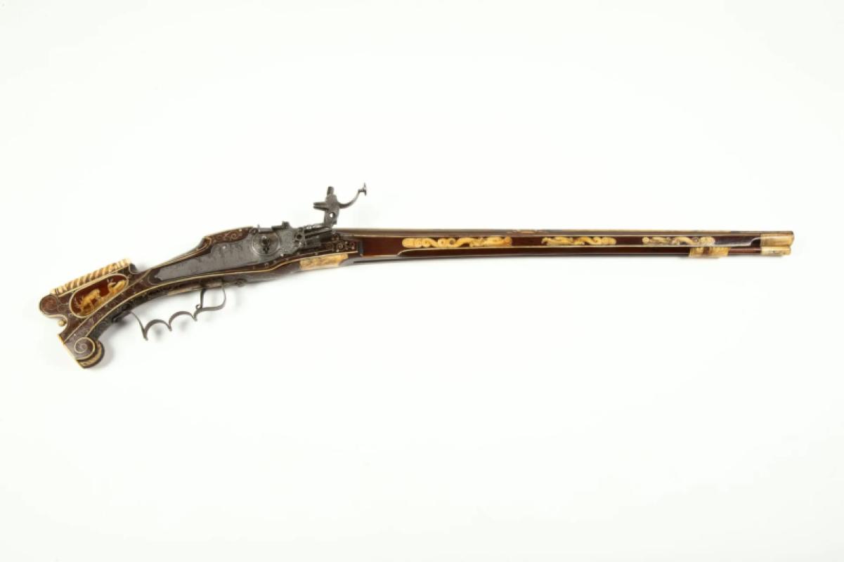 Les armes de prestige munichoises du début du XVIIème siècle sont célèbres pour le raffinement de leurs décors. La gravure en relief à fond d'or du canon est typique de cette production d'élite. Hieronymus Borstorffer (actif entre 1597 et 1637), travaillant en collaboration avec de grands fabricants tels Daniel Sadeler (actif entre 1602 et 1632) ou Caspar Sät (vers 1611-1691) fut l'un des plus fameux artistes spécialisés dans l'incrustation d'ivoire sur les armes destinées non seulement aux princes électeurs de Bavière, mais également aux cours européennes. L'utilisation d'ivoire de morse est très intéressante car rare dans la production. elle peut s'expliquer notamment par la présence de l'animal sur les côtes Nord du Pays ainsi que par les rapports entre les principautés germaniques et les royaumes scandinaves du Nord.