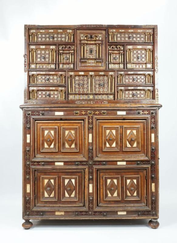 Bargueño en deux corps en bois naturel mouluré à riche décor incrusté en ivoire d'éléphant (Elephas maximus, Loxodonta africana ou Loxodonta cyclotis) et os, le corps supérieur ouvrant par onze tiroirs en façade et un portillon central découvrant trois autres tiroirs, le corps inférieur ouvrant par quatre grands tiroirs.