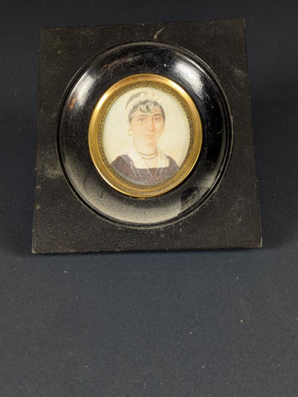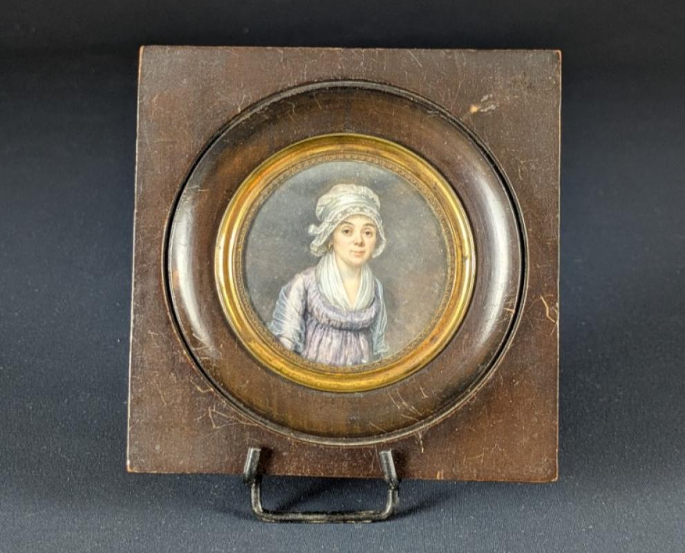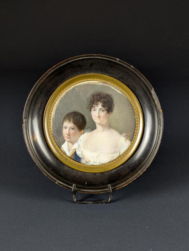 Miniature en tondo peinte à la gouache sur feuille d’ivoire d’éléphant (Elephas maximus, Loxodonta africana ou Loxodonta cyclotis) représentant une mère et son fils. Signé et daté 1809 vers le bas à gauche. Cadre à cuvette en bois noirci à lunette en laiton.