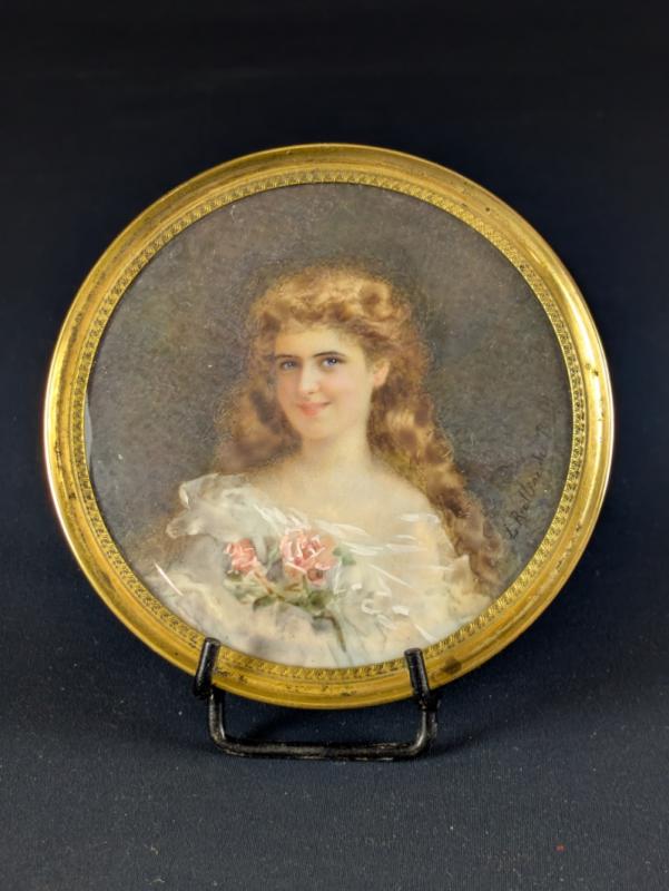 Miniature circulaire peinte à la gouache sur feuille d’ivoire d’éléphant (Elephas maximus, Loxodonta africana ou Loxodonta cyclotis) représentant une jeune femme au bouquet de rose, signé L . Rallier du Baty vers le bas à droite. Dans une lunette en laiton doré.