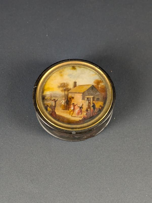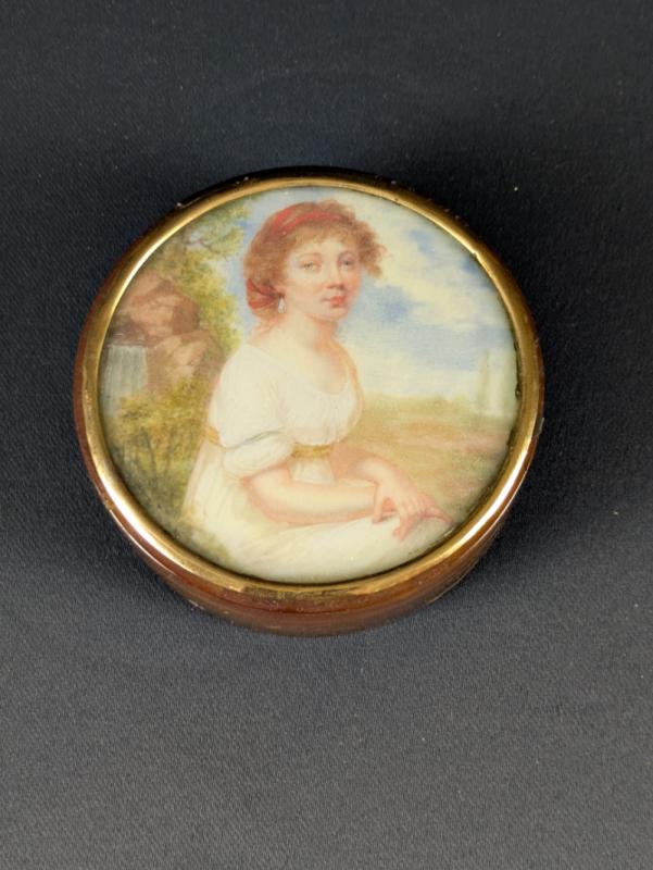 Boite de forme circulaire en écaille blonde ( Eretmochelys Imbricata ) ouvrant par un couvercle libre orné d’une miniature sous verre représentant une jeune femme assise près d’une cascade à la gouache sur feuille d’ivoire d’éléphant (Elephas maximus, Loxodonta africana ou Loxodonta cyclotis).