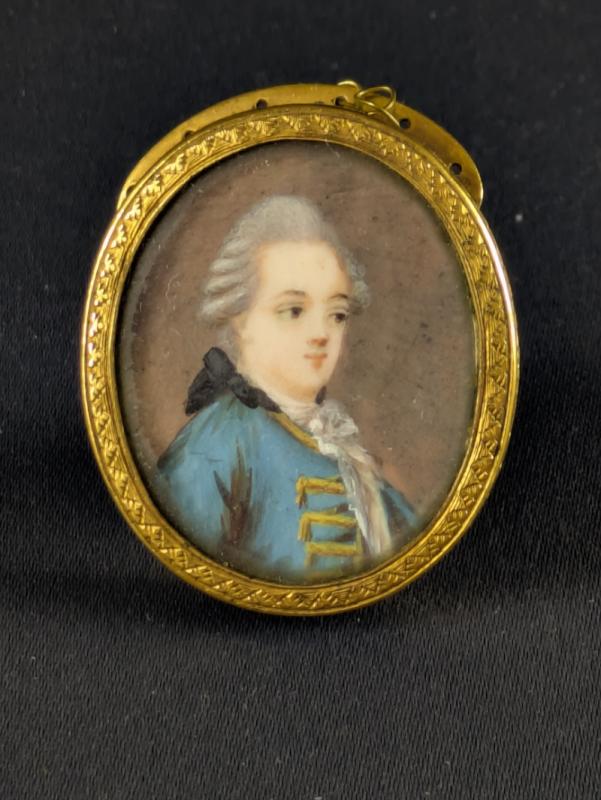 Elément de bracelet souvenir en métal doré de forme médaillon orné d’un portrait d’homme en miniature peint à la gouache sur feuille d’ivoire d’éléphant (Elephas maximus, Loxodonta africana ou Loxodonta cyclotis).
