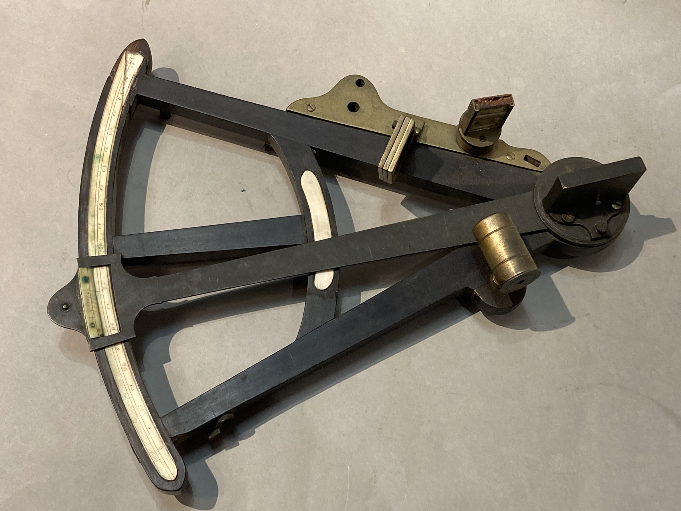 Octant à pinnule en ébène incrusté d'un limbe gradué, d'une graduation et d'un cartouche en ivoire d'éléphant, marqué PBR, ép 1ère moitié XIXème, H : 35.5 cm (élément médian en ivoire remplacé, petite restauration à une extrémité) Expert : Monsieur Grignon Dumoulin CIC n° : FR2607600001-K