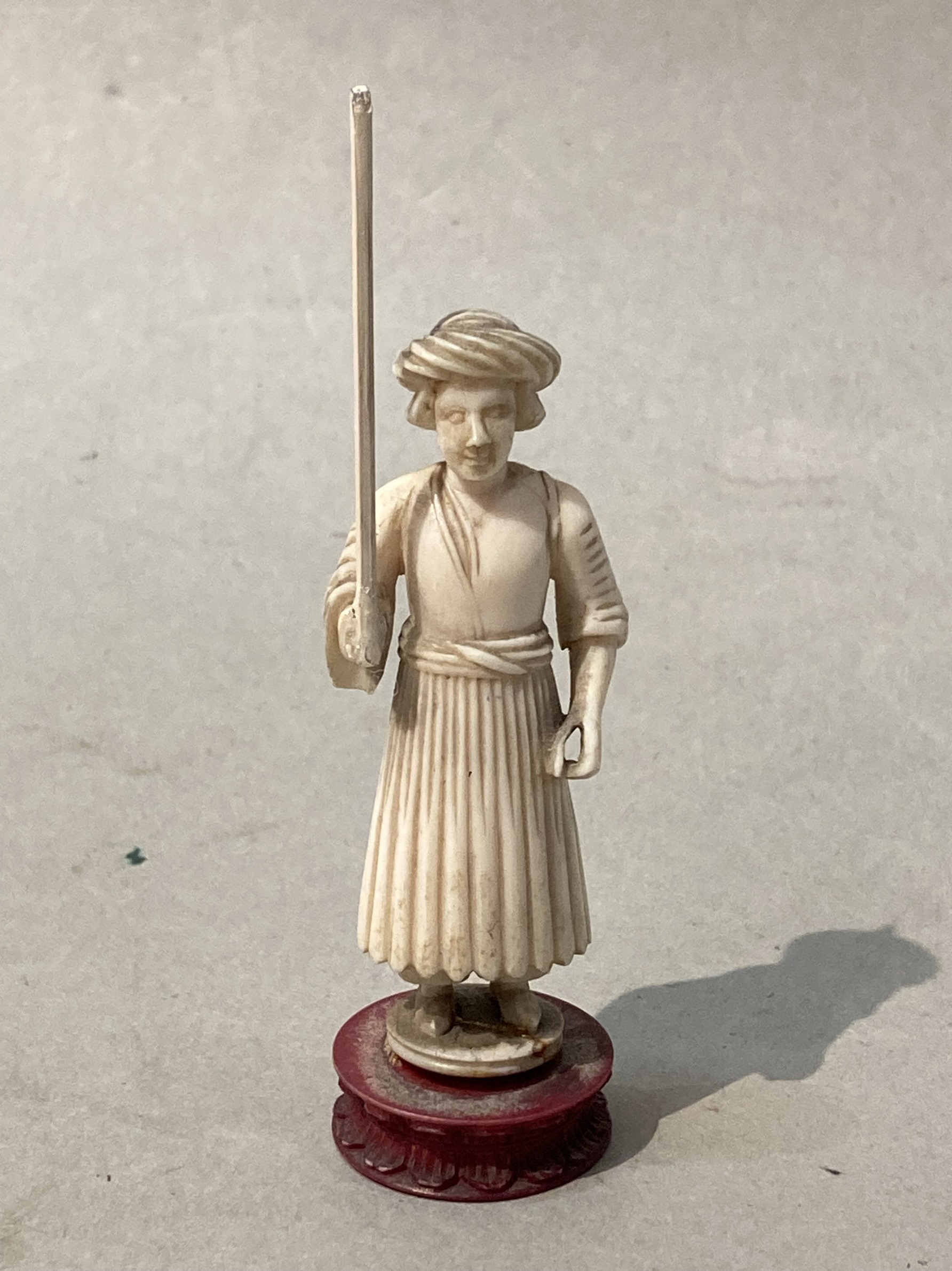 Inde : Sujet en ivoire d'éléphant représentant un garde du maharadjah tenant un bâton (rapporté) dans sa main droite, reposant sur un socle en bois peint, 2ème moitié XIXème, H : 9 cm  Expert : monsieur Grignon Dumoulin  CIC n° : FR2507600166-K