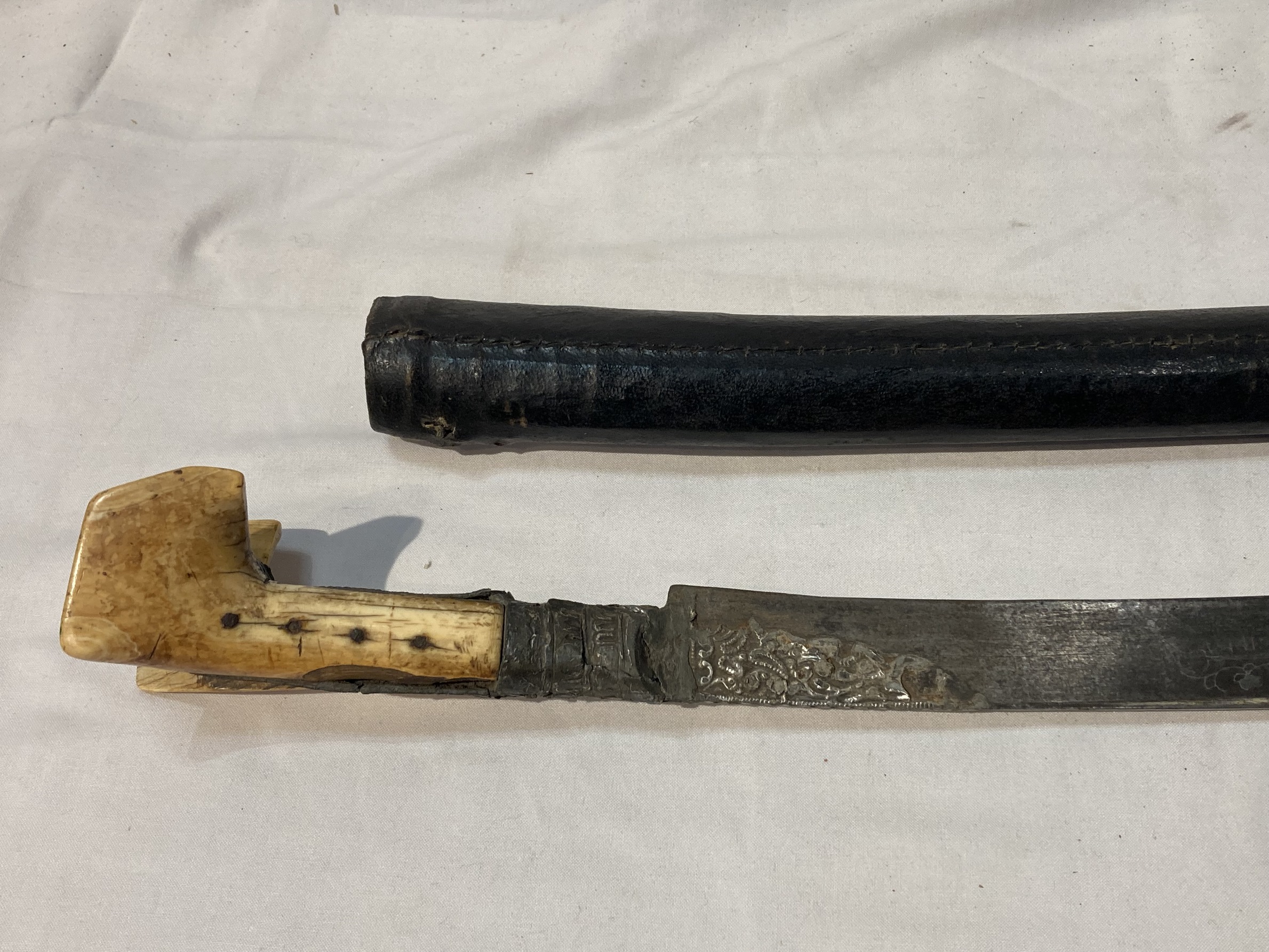 Empire ottoman : Yatagan à poignée avec 2 plaquettes en ivoire d'éléphant, dites en oreilles de chien, partie médiane en métal repoussé (argent ?), lame légèrement courbe à 1 gouttière et léger décor damasquiné, fourreau en bois recouvert de cuir noir, ép fin XIXème, L totale : 61 cm (qq usures) Expert : Monsieur Grignon Dumoulin CIC n° : FR2605000005-K
